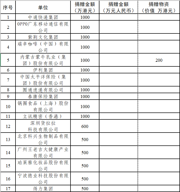 通过汇总公开信息,经中国光彩会不完全统计,截至28日17点,在前期已经发布的基础上,新增25家民营企业共捐赠14700万港元、620万元人民币和价值200万港元的物资,用于支持香港火灾救援及灾后重建。其中中国光彩会第七届理事单位、光彩100民营企业公益基金会联盟成员单位新增捐赠4500万港元、220万元人民币,分别是:中通快递集团捐赠1000万港元,圆通速递有限公司捐赠1000万港元,泰康保险集团捐赠1000万港元,伊利集团捐赠1000万港元,珀莱雅化妆品股份有限公司捐赠500万港元,广州市视源公益慈善基金会捐赠200万元人民币,龙湖公益基金会捐赠20万元人民币。