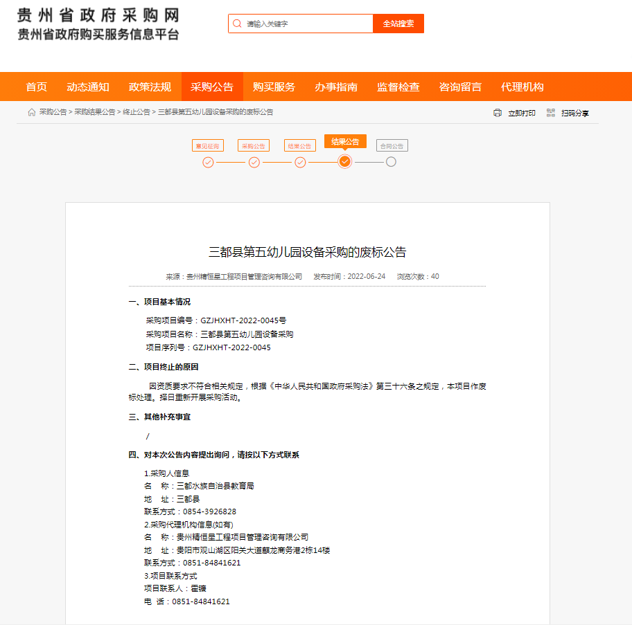 3. 三都县第五幼儿园教学设备采购项目。资助资金50万元,用于购买空调、幼儿绘本、桌椅、室外玩具等。本期完成资助协议签署,执行方在三都县公共资源交易中心进行招投标,因中标企业资质要求不符合相关规定,执行方在贵州省政府采购网上进行废标公示。未拨付项目资金,待拨付项目资金50万元,后续将根据项目进展,结合协议约定进行拨付。